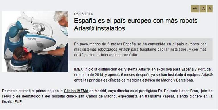 8. España fue líder en trasplantes de pelo con tecnología robótica en los últimos meses del año 2014. IMEMA ha sido la Clínica que más trasplantes de pelo, utilizando el Artas Robot, ha realizado en el último trimestre del 2014, en el mundo.
