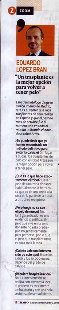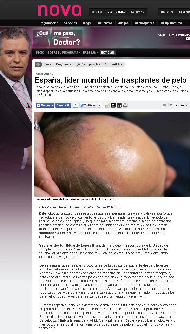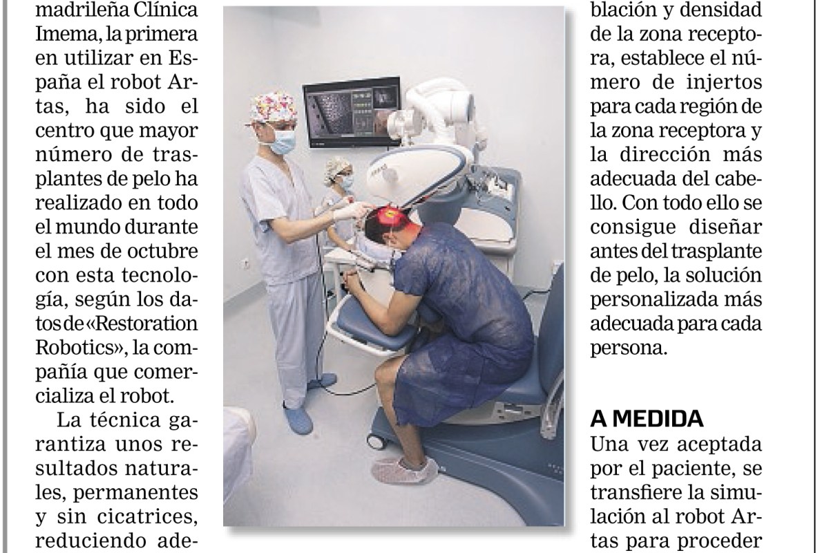 La Clínica Imema se consolida como un referente mundial en trasplantes de pelo con el robot Artas. Fue la primera clínica en España en disponer de esta nueva tecnología, y en pocos meses se convirtió en líder mundial en trasplantes de pelo con el robot Artas. Además es Centro de Formación para Europa en el manejo del robot Artas de médicos y cirujanos.