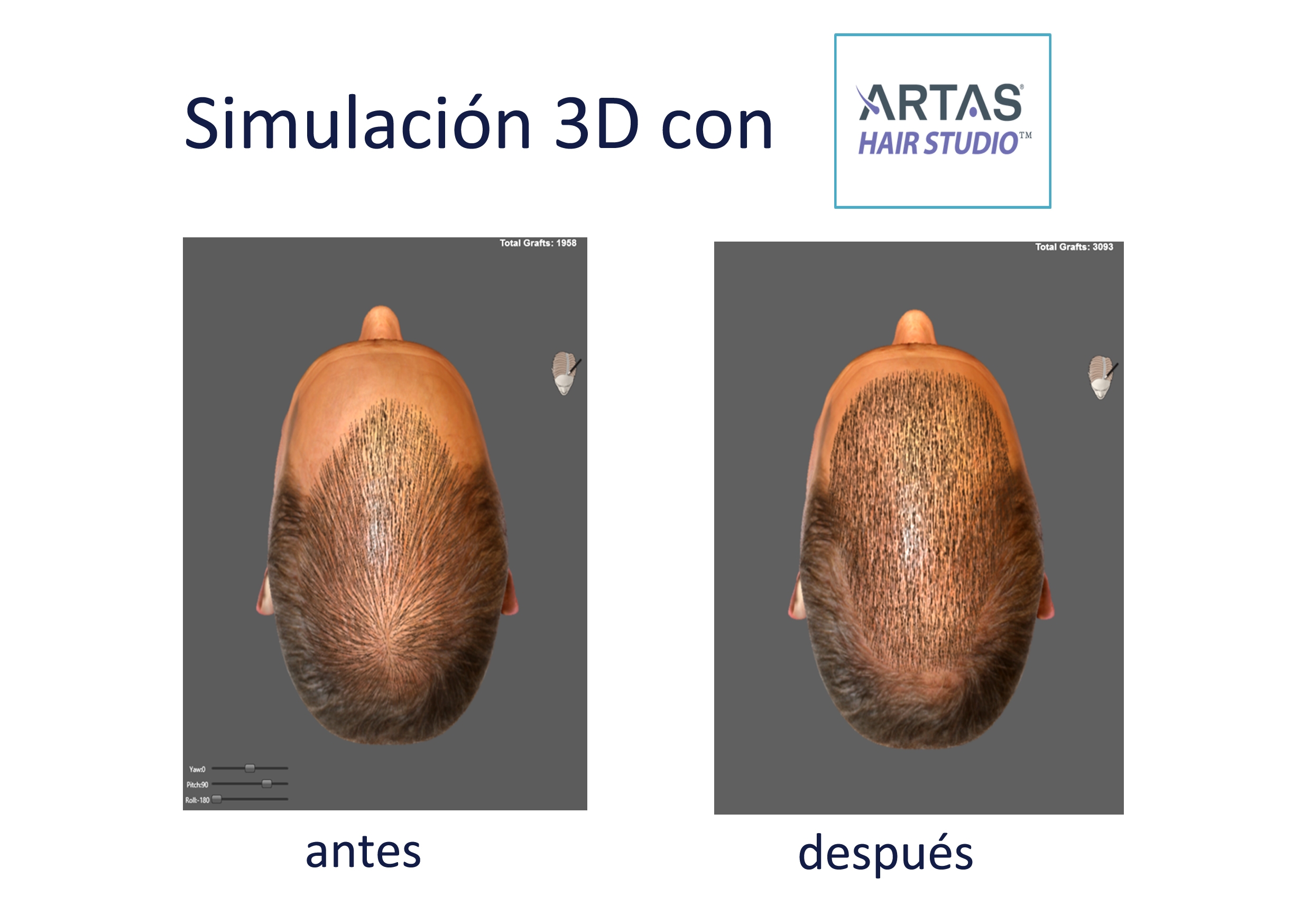 Simulación 3D ARTAS trasplante de pelo, antes y después